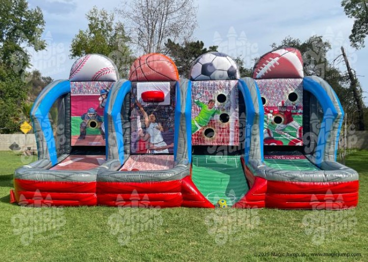 Throw for a touchdown! Shoot a goal past the keeper! Aim for a basket! Pitch a strikout! Magic Jump's Sports Shootout gives participants the opportunity to test their skills at each of these challenges. This is an attractive sports inflatable that is sure to stand out anywhere. The arching pillars and enclosing nets separate each lane while an inflatable football, basketball, baseball and soccer ball stands atop identifying each lane. Those who take on the Sports Shootout are sure to enjoy hours of challenging fun. The football and soccer lanes have numerous slots to aim at while the basketball hoop tests a shooter's range and the baseball catcher tests the strength and accuracy of your pitch. The Sports Shootout ramp returns the ball to participants and collects the ball in each lane!.