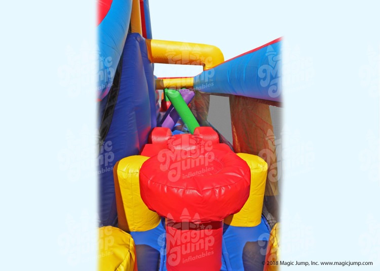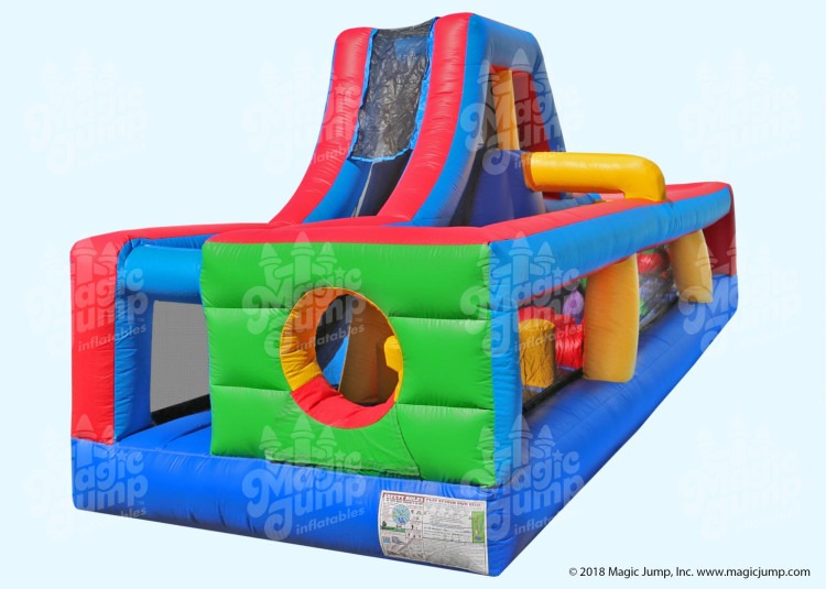 New for 2018: A fun and compact obstacle course that features 6 unique obstacle elementals riders have to go through along with a climber and slide at the end. 28 feet of obstacle course followed by a 180 degree turn, and 28 feet more of climber and slide. Truly a 56 feet long inflatable obstacle course. Riders start and finish on the same side, making it a good obstacle course for backyard events. Good for ages 4 and up.